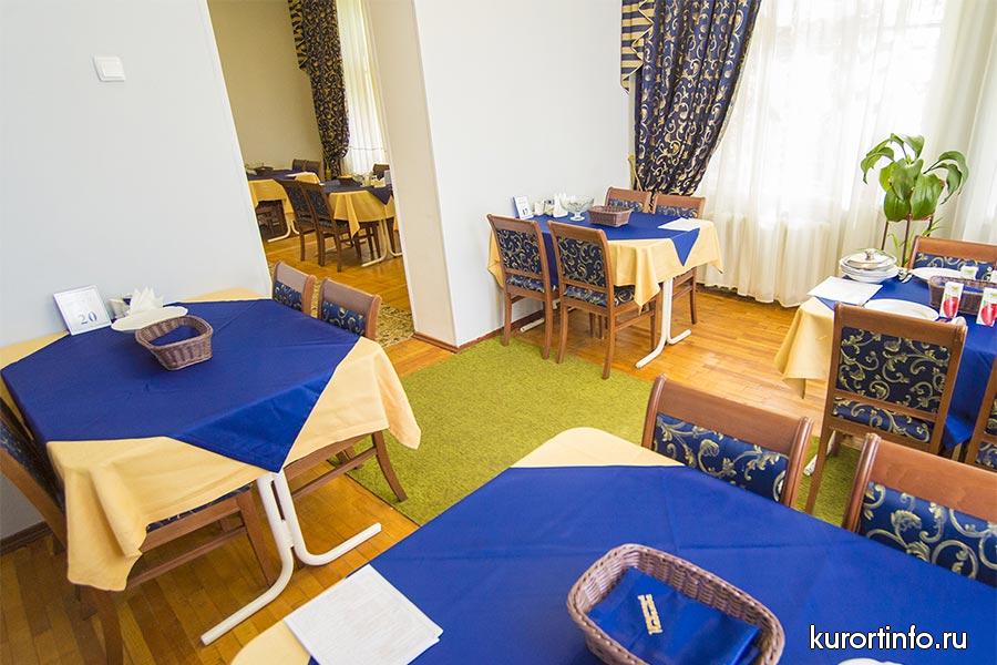 Отдельного внимания заслуживает организация приема еды в санатории «Надежда». Для того чтобы гости чувствовали себя максимально комфортно в здравнице есть 4 уютных обеденных зала, которые оформлены в разных цветовых гаммах.
