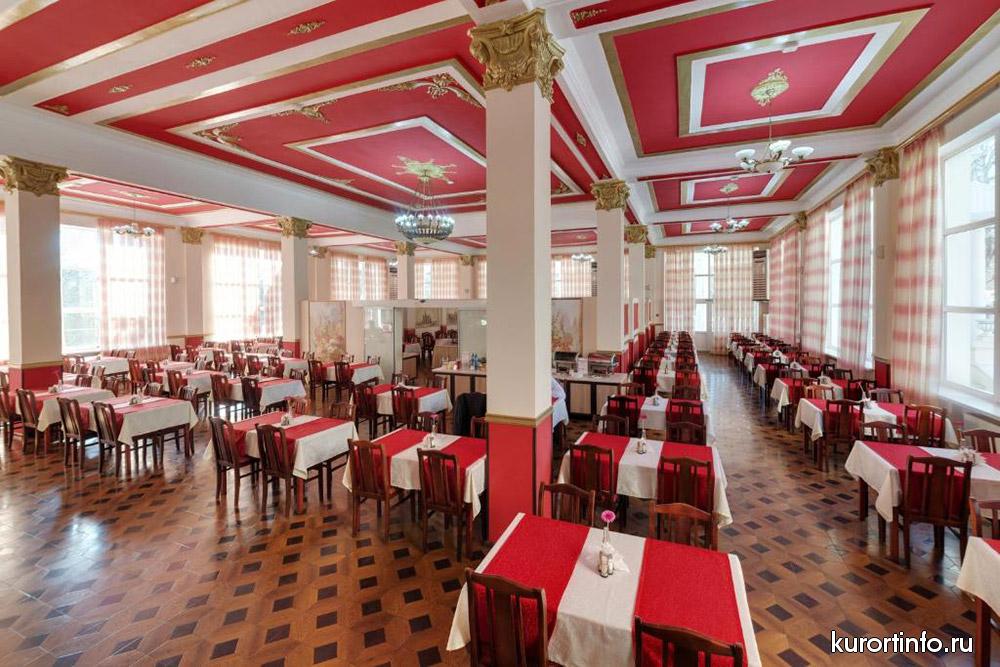 В Кисловодской здравнице предусмотрено 3х разовое питание. Завтрак с 08:00 до 09:30, обед с13:00 до 14:30 и ужин с17:30 до 19:00. Время выбрано с учетом лечебных и оздоровительных процедур, которые проходят гости санатория. Питание проходит в просторной столовой, банкетном зале и на красивой летней террасе.