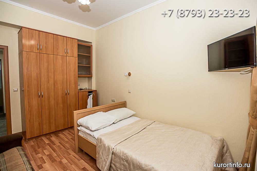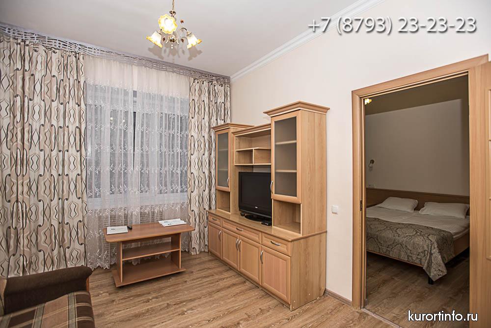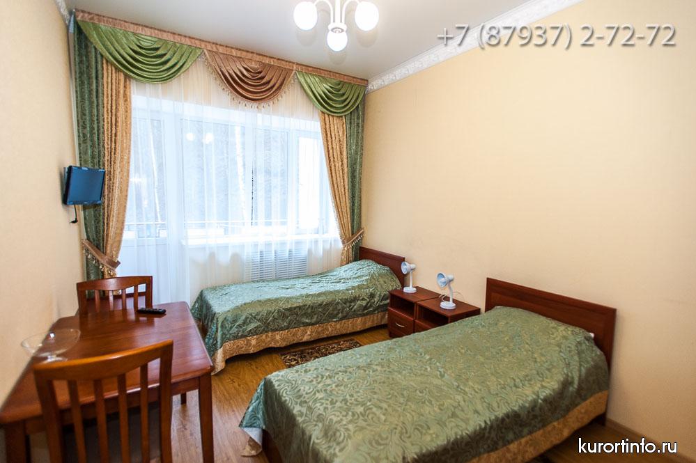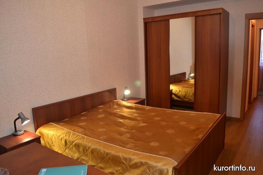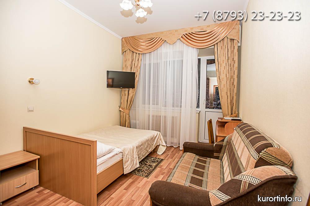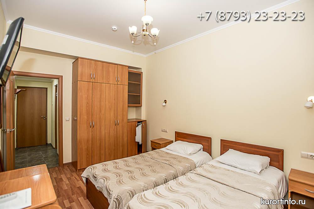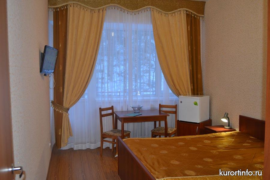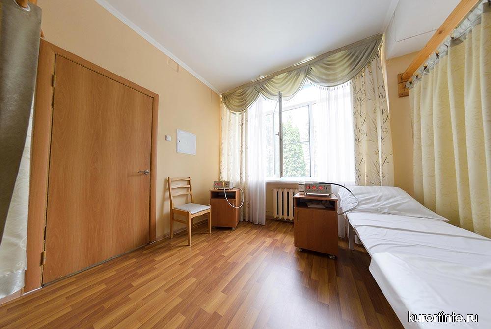 Каждый номер санатория оборудован всем необходимым для комфортного проживания и отдыха: посудой, электрочайником, телевизором, холодильником, ванными принадлежностями, феном и сейфом.