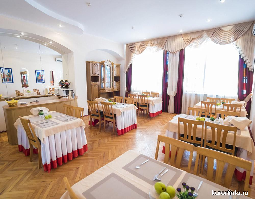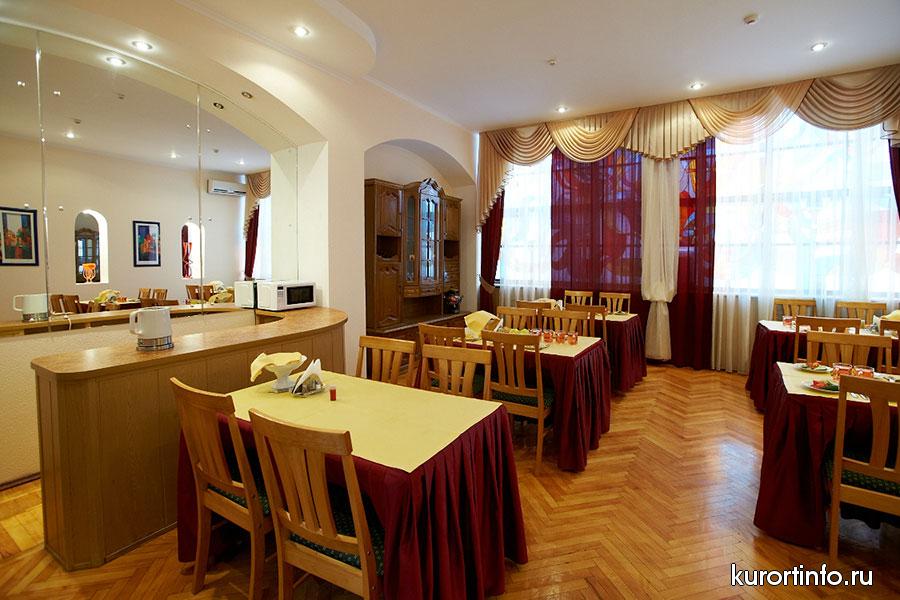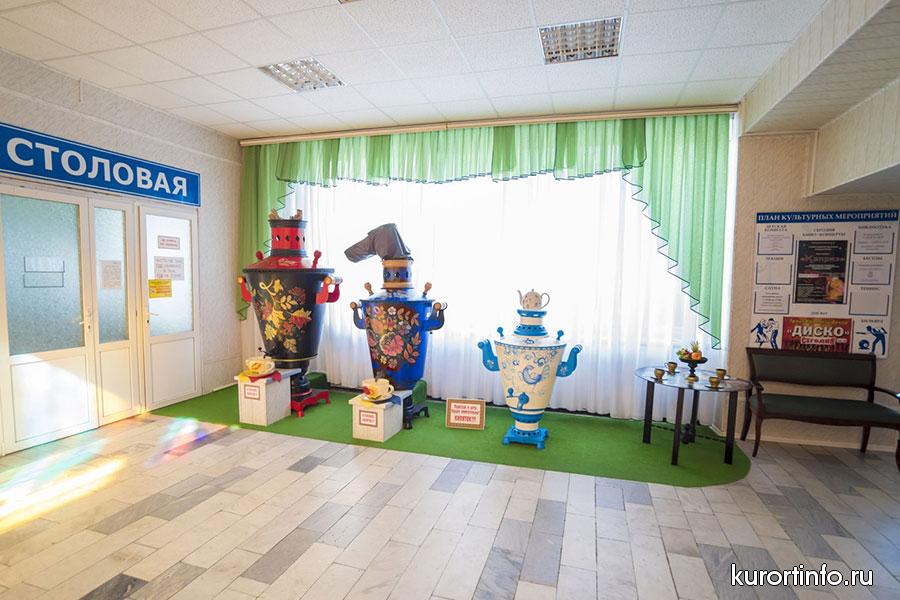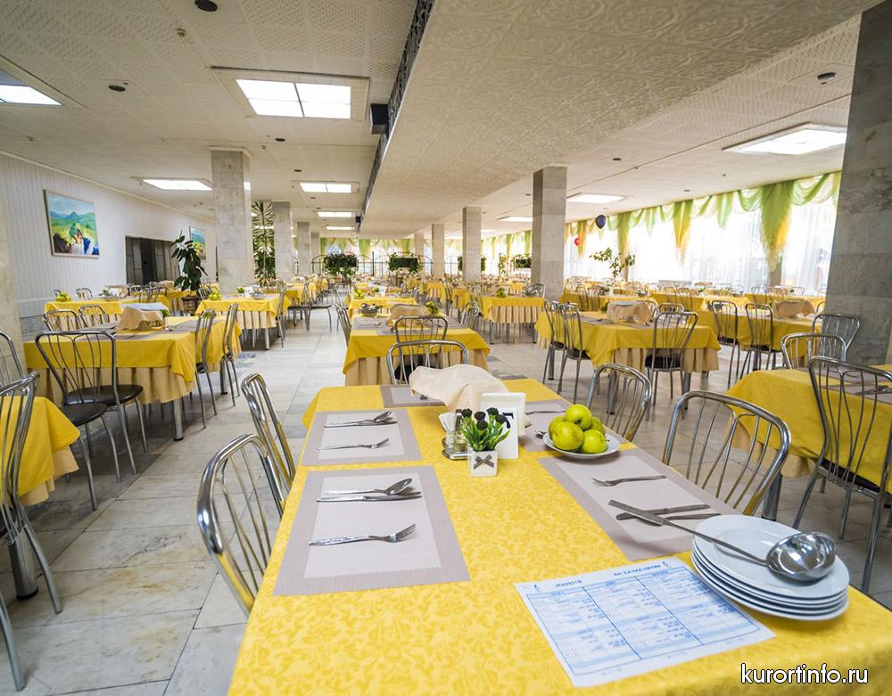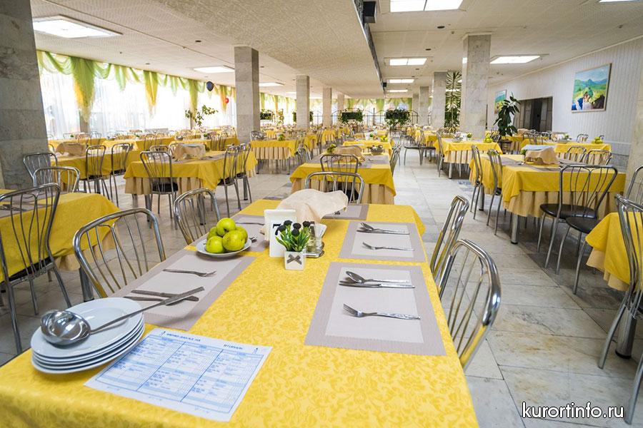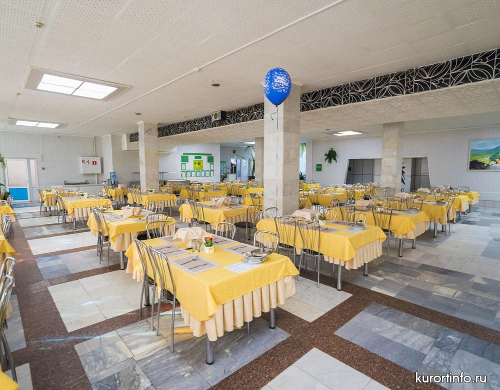В просторной столовой здравницы гостей ждет не просто качественное питание, а сбалансированная лечебная диета. Меню санатория всегда разнообразное, а еда приготовлена по-домашнему.