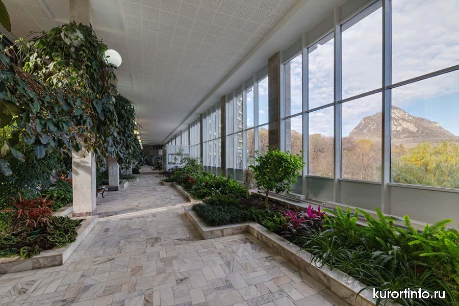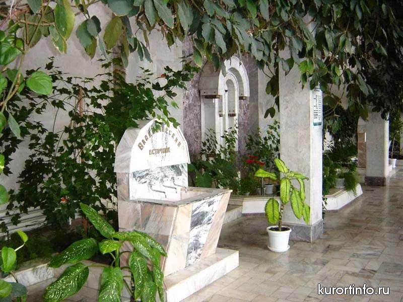 Железноводский санаторий называют дворцом здоровья - внутри просторной здравницы много света, красивый зимний сад, фонтаны и один из известных во всем мире источник минеральной воды - "Владимирский".