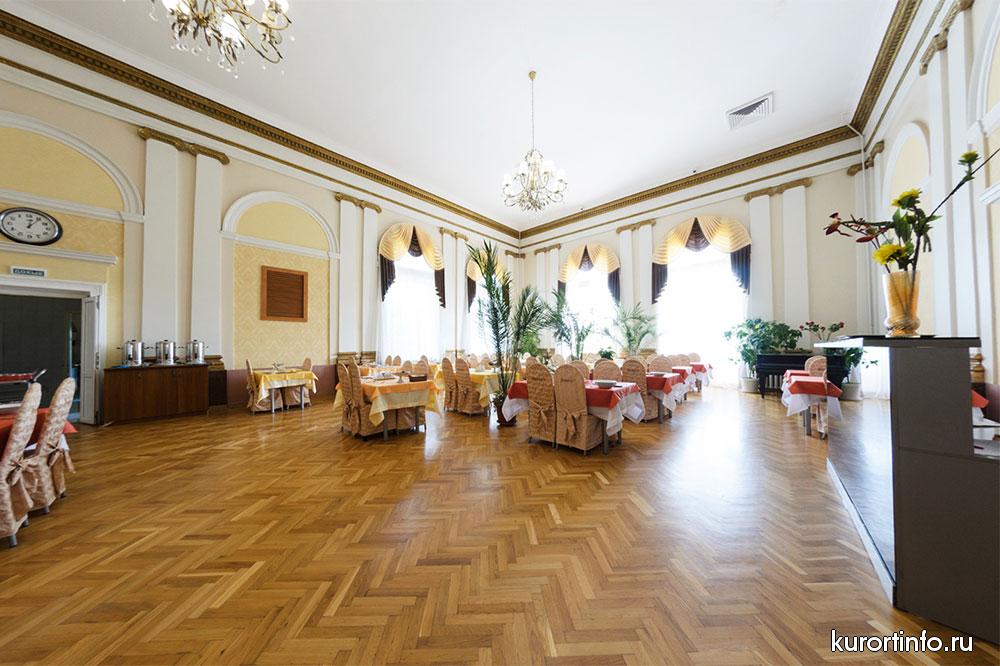 Железноводский санаторий располагает просторным обеденным залом, который может вместить до 100 посетителей.