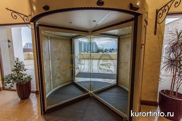 Гостиничный комплекс «Богатырь» выполнен в виде замка с башнями, с восточной стороны из которых открывается величественный вид на Кавказские горы.